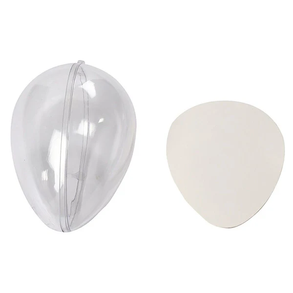 Kaksiosainen kananmunan muotoinen kirkas, sileä muovinen suspensio erottelemiseksi, täyttämiseksi koristeella ja kokoamiseksi.