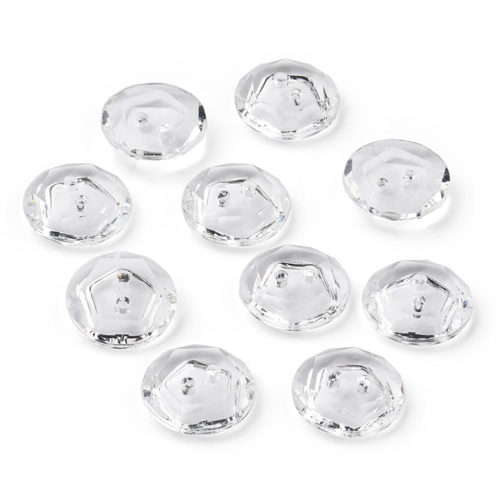 Setti sisältää 10 kirkasta muovista kristallinappia, halkaisijaltaan 12 mm. Viistehiottu pinta heijastaa valoa kauniisti ja tuo projekteihisi elegantin yksityiskohdan.