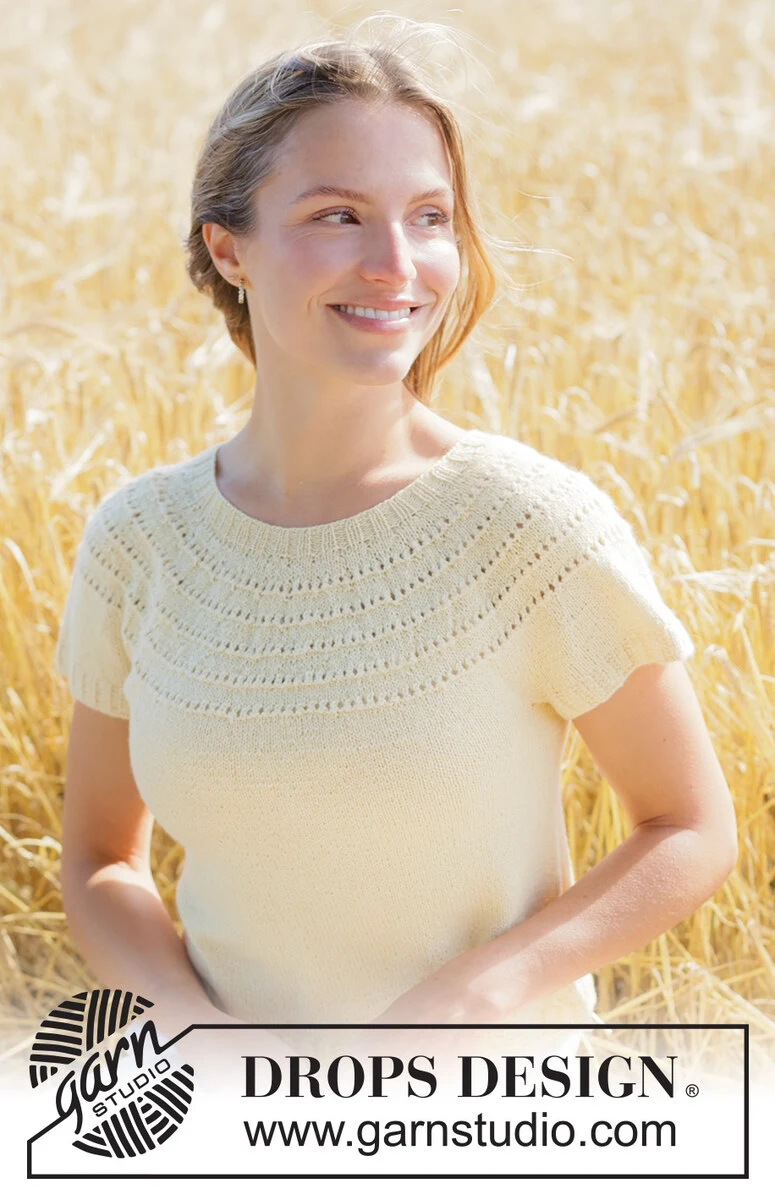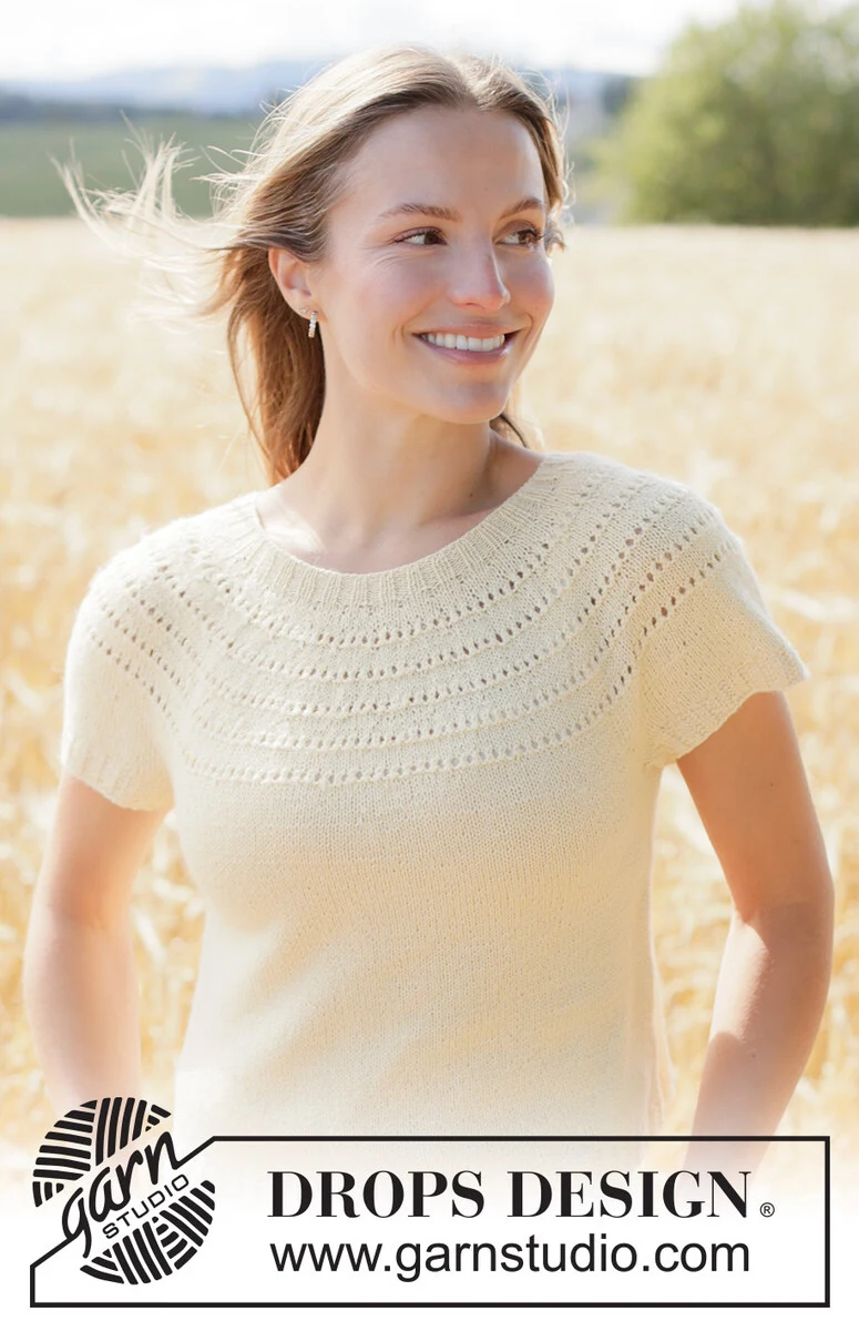 Ylhäältä alas neulottu pusero DROPS Nord-langasta. Työssä on lyhyet hihat, kaarroke ja pitsineuletta. Koot XS - XXXL.