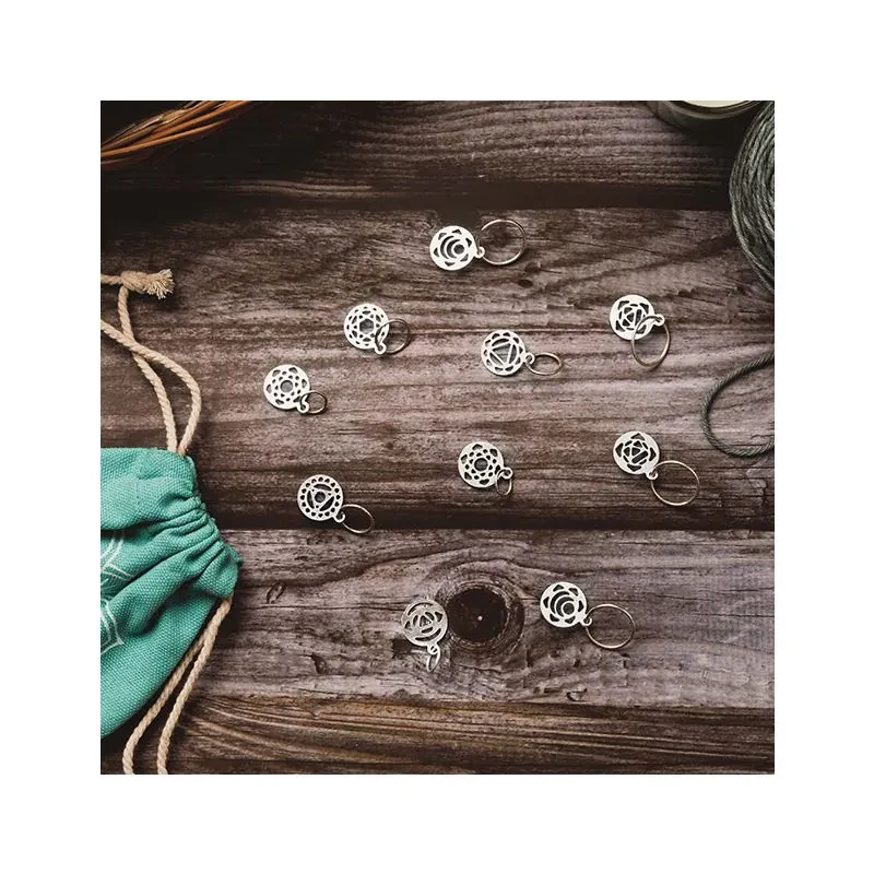 Elegantti sarja silmukkamerkkejä, joissa on seitsemän symbolista chakrakuosia hopeapinnoitteella. Täydellinen tietoiselle neulojalle tarkkaan merkintään.