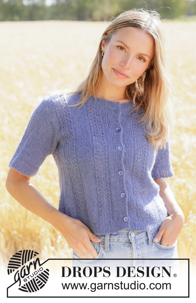 Ylhäältä alas neulottu jakku DROPS Brushed Alpaca Silk -langasta. Työssä on lyhyet hihat ja pitsineuletta. Hihat neulotaan suoraan jakkuun kiinni. Koot XS - XXXL.