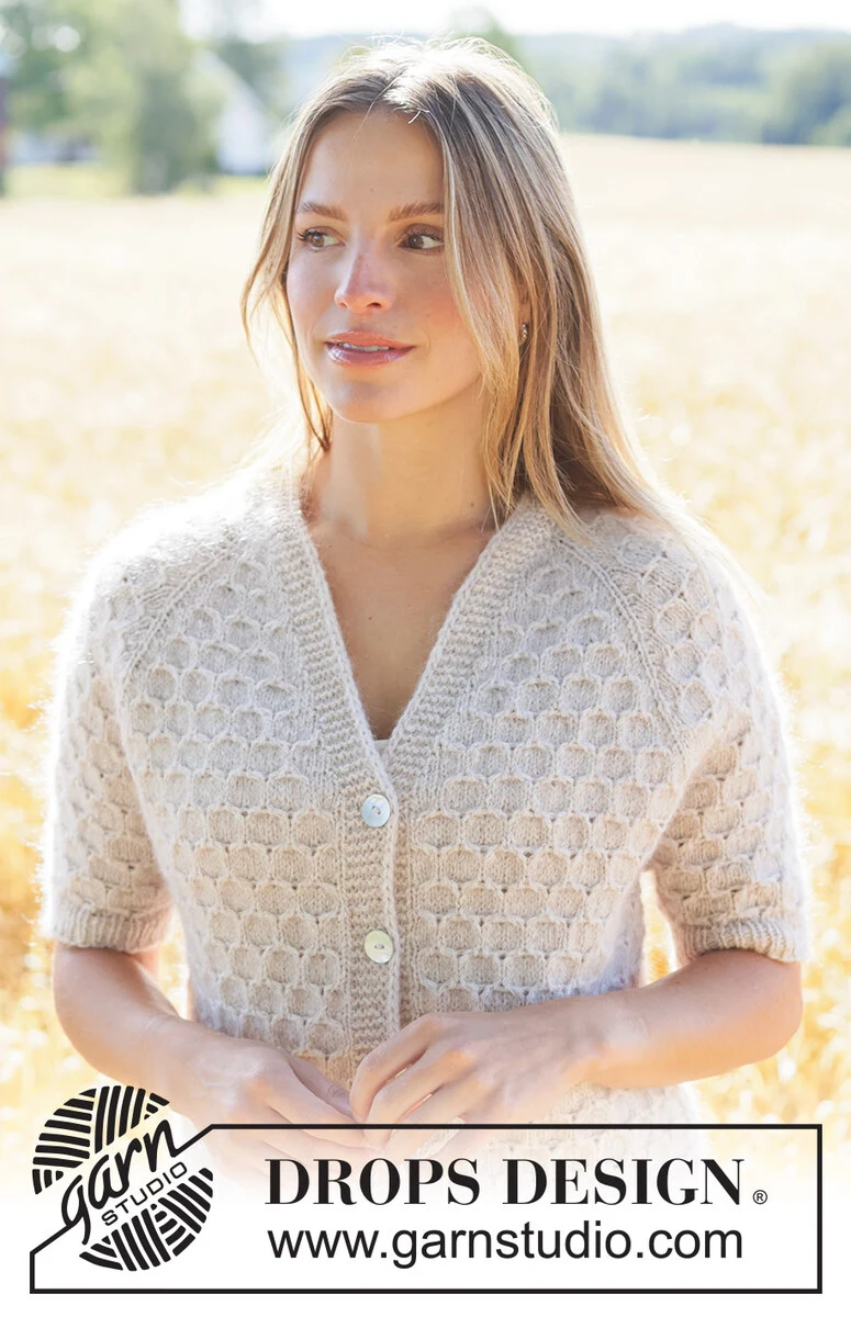 Ylhäältä alas neulottu jakku DROPS Sky- ja DROPS Kid-Silk -langoista. Työssä on lyhyet hihat, raglanlinjat, V-aukko, i-cord-reunus ja hunajakennokuvioita. Koot XS - XXXL.